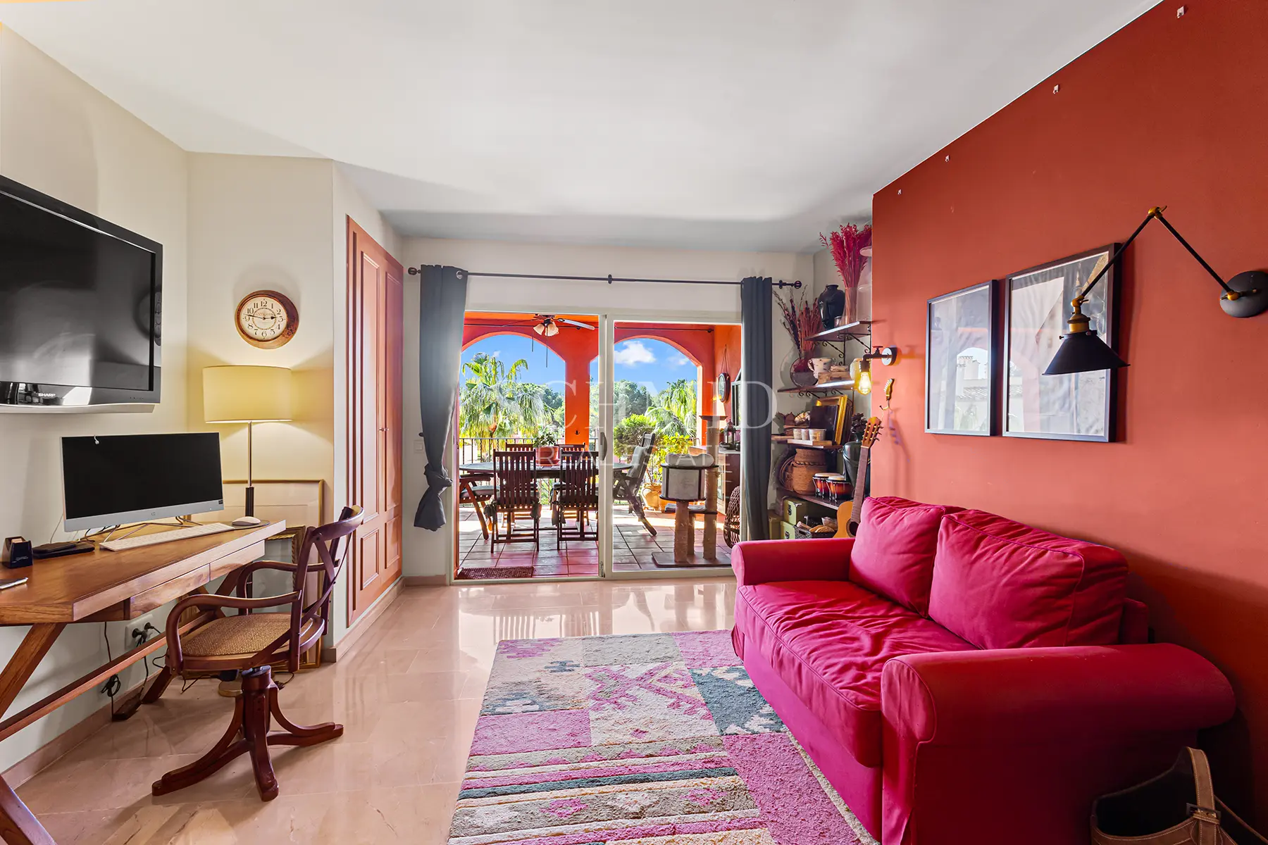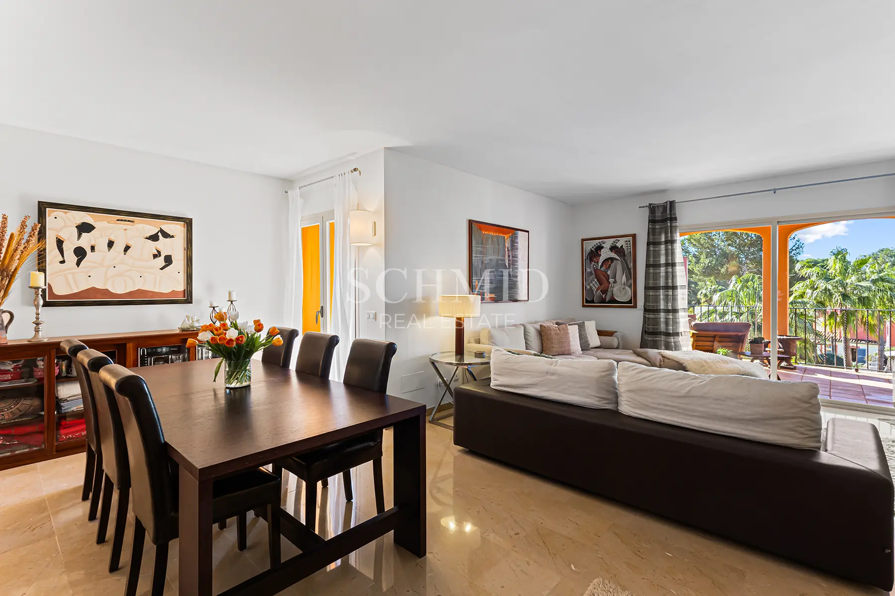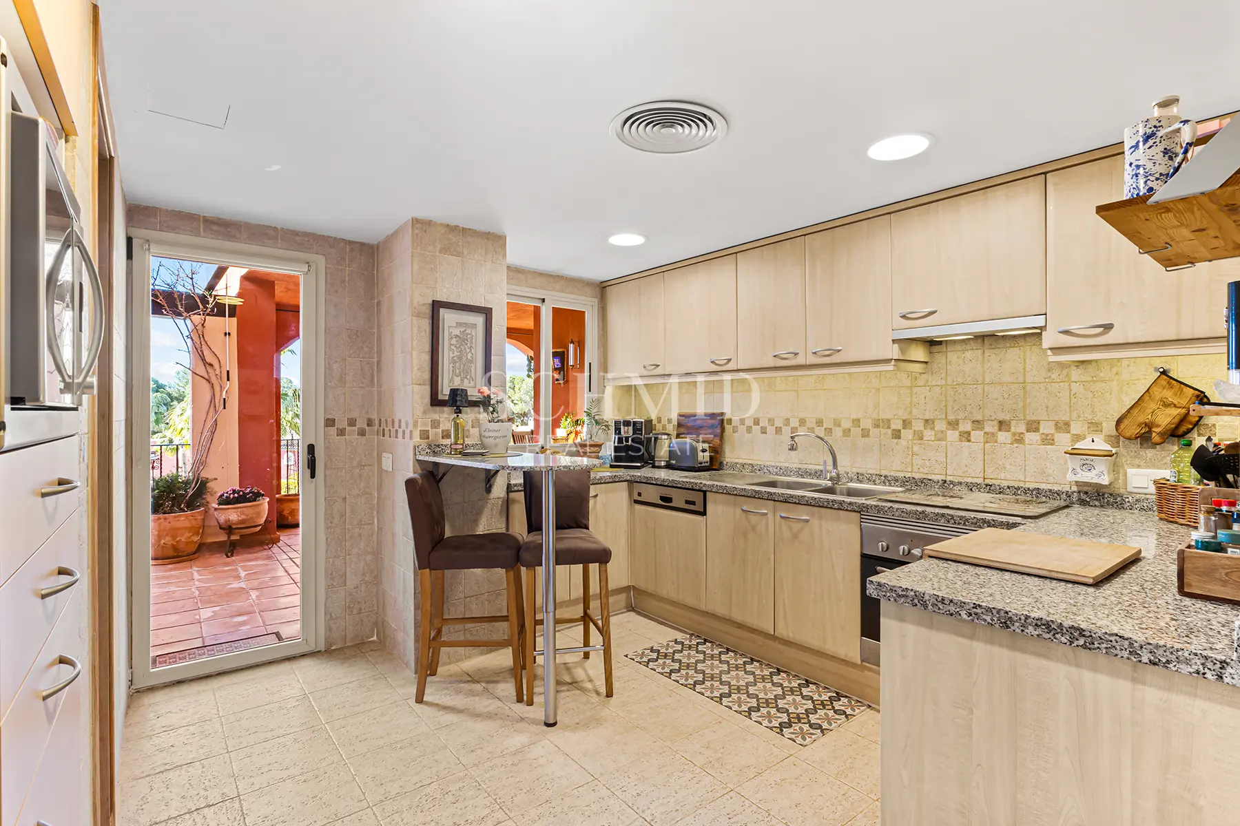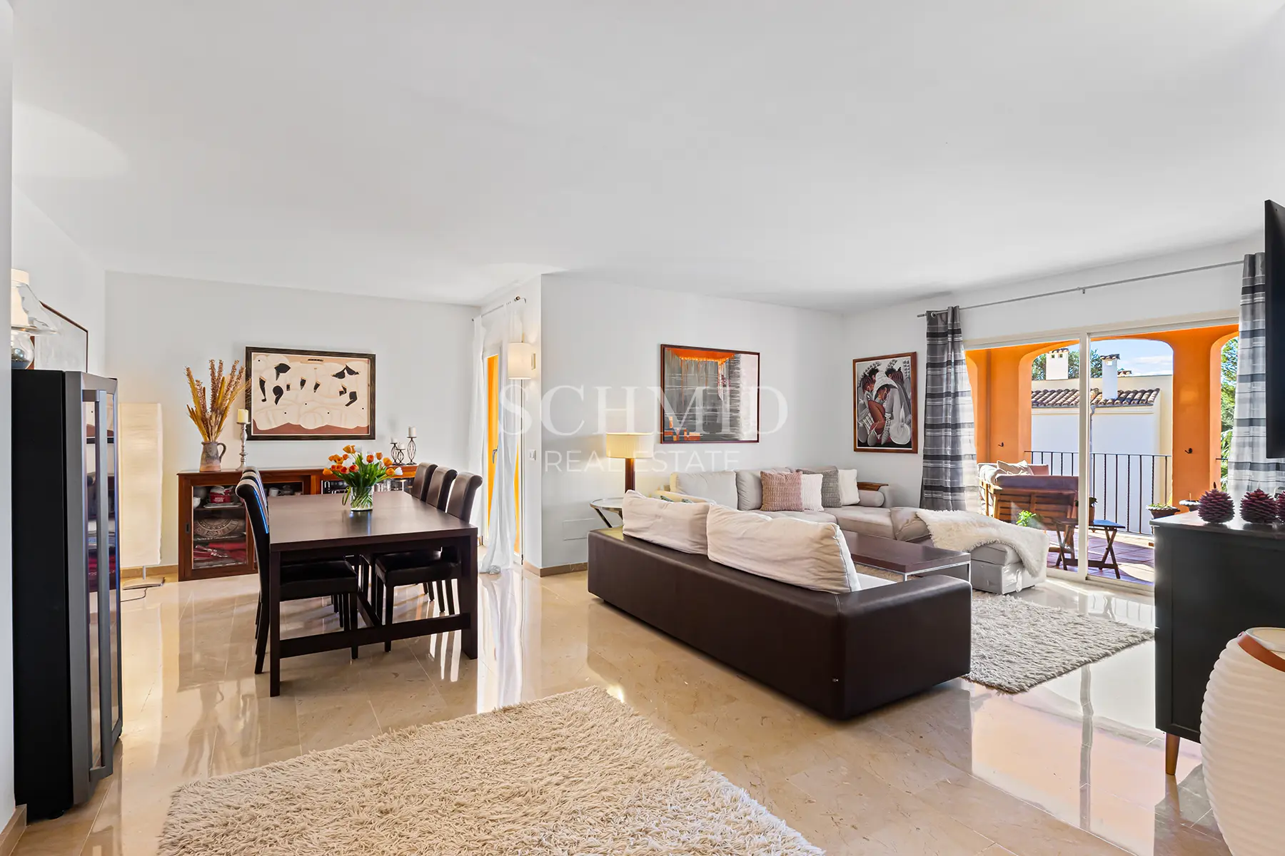Das Herzstück der Immobilie bildet der offen gestaltete Wohn- und Essbereich mit direktem Zugang zur weitläufigen, überdachten Terrasse. Von hier aus eröffnet sich ein harmonischer Blick auf die liebevoll angelegte Gartenlandschaft und den Poolbereich der Anlage. Die angrenzende Einbauküche verfügt über einen separaten Hauswirtschaftsraum.