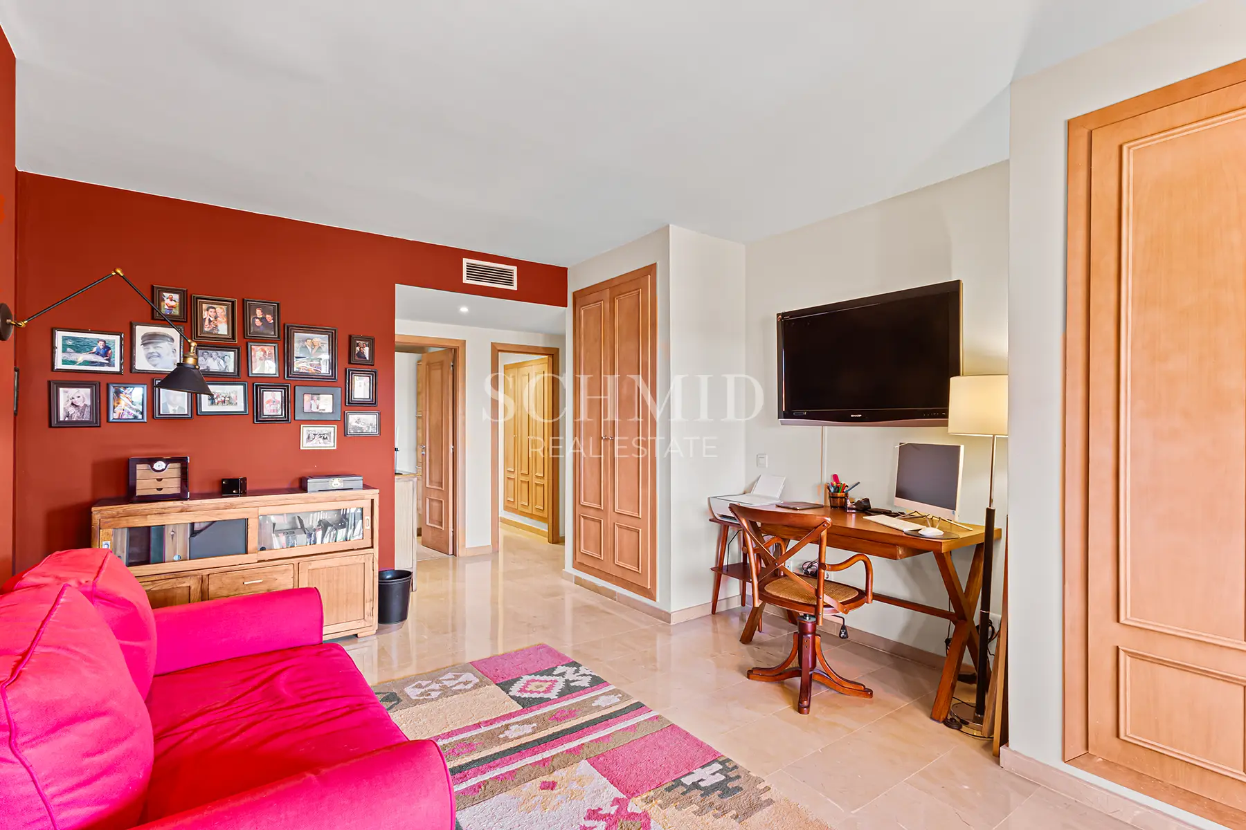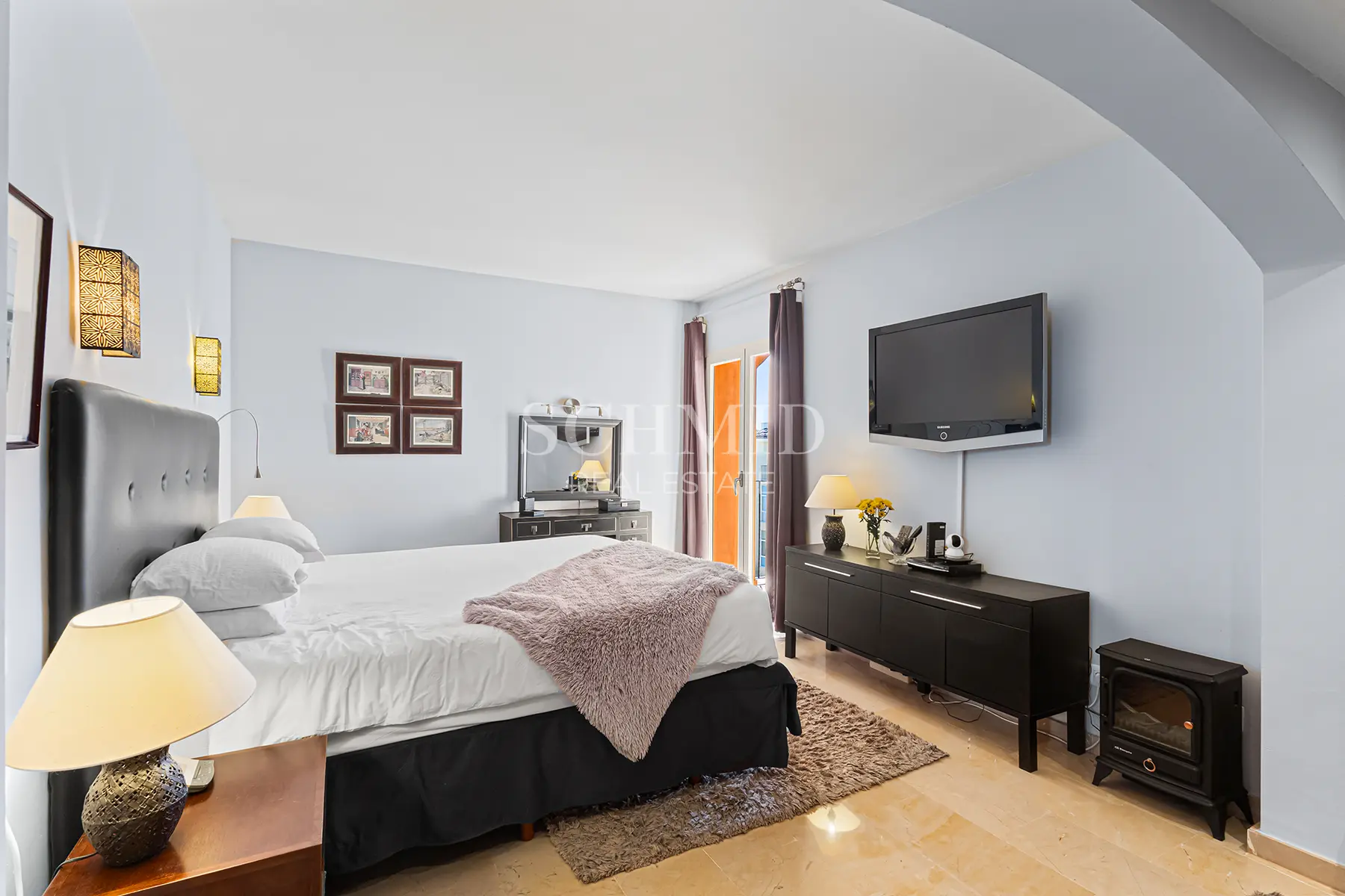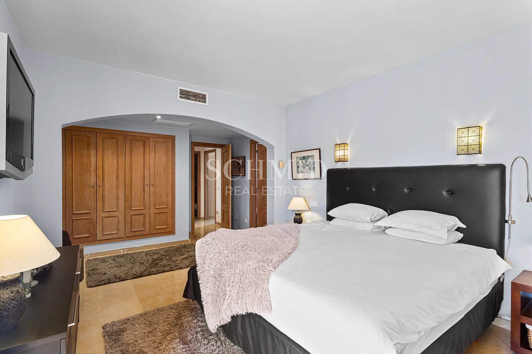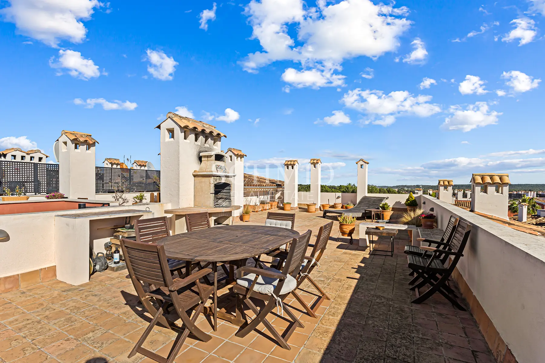 Das Penthaus bietet drei komfortable Doppelschlafzimmer und insgesamt drei Badezimmer, zwei davon en Suite. Die großzügige Dachterrasse mit einer Fläche von über 143 m² stellt ein besonderes Highlight dar: Mit Chill-out-Area, Barbecue-Ecke und einem weiten Blick über die mediterrane Umgebung bis hin zum Meer.