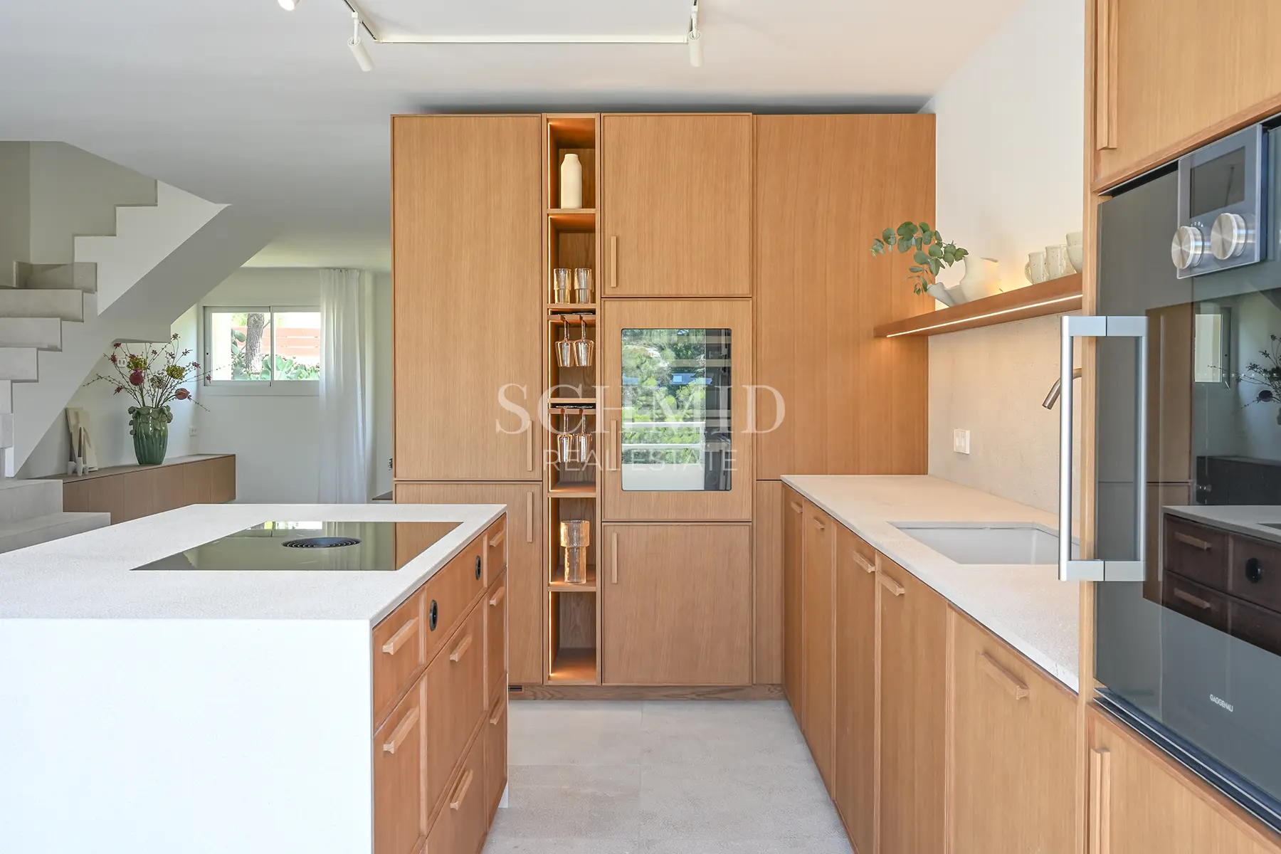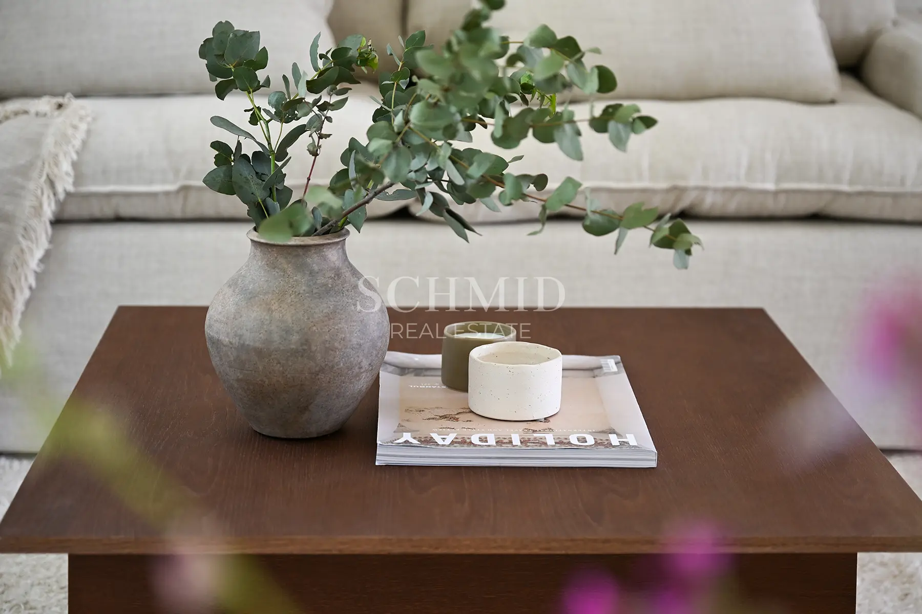 Bereits beim Betreten der Wohnung beeindruckt der offen gestaltete Wohn- und Essbereich, der einen nahtlosen Übergang zur Terrasse mit herrlichem Blick auf das Meer bietet. Die moderne Einbauküche fügt sich harmonisch in den Wohnraum ein und ist mit exklusiven Gaggenau-Geräten ausgestattet.