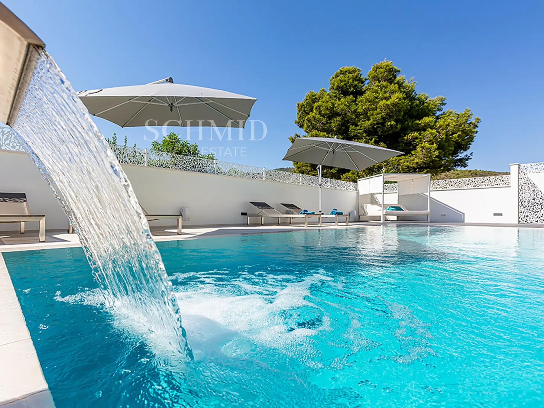 Der Außenbereich überzeugt mit sonnigen Terrassen, einem großzügigen Pool mit Lounge-Bereich und mediterraner Bepflanzung.