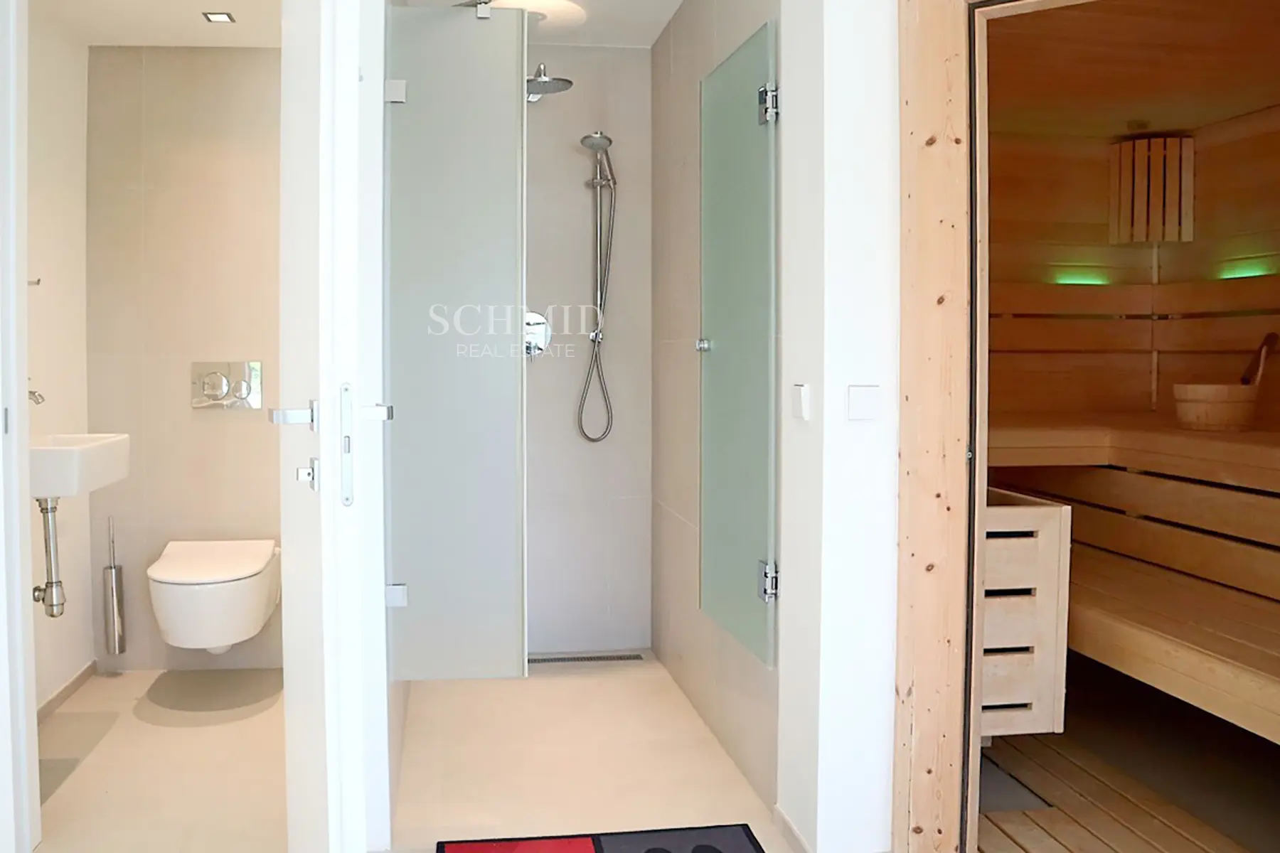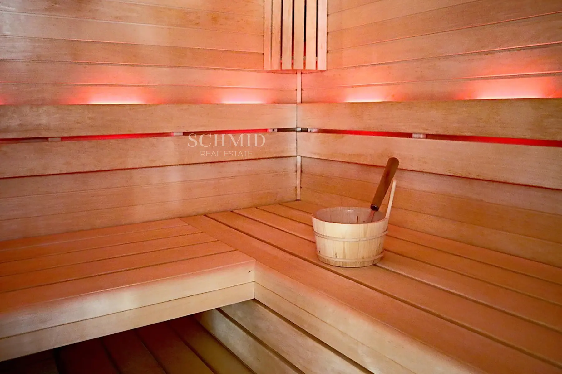 Die Villa verfügt über vier komfortable Schlafzimmer und vier stilvolle Badezimmer. Ein Spa-Bereich mit Sauna und Fitnessraum bietet einen Rückzugsort für Entspannung und Wohlbefinden. Ein praktischer Hauswirtschaftsraum, ein Abstellraum und zwei Stellplätze sorgen für zusätzliche Funktionalität.