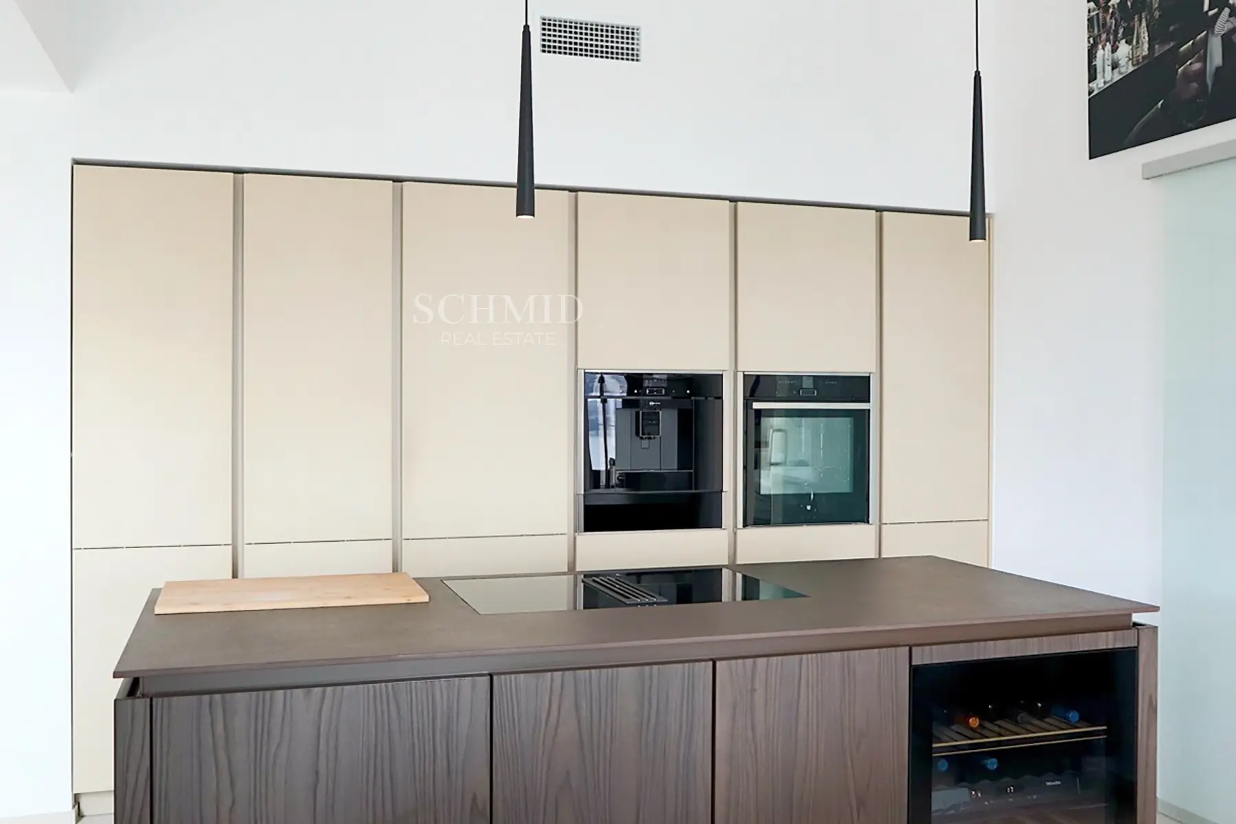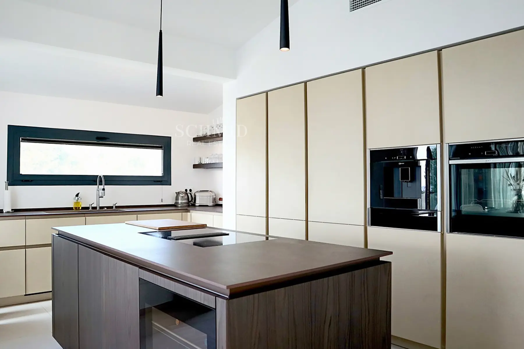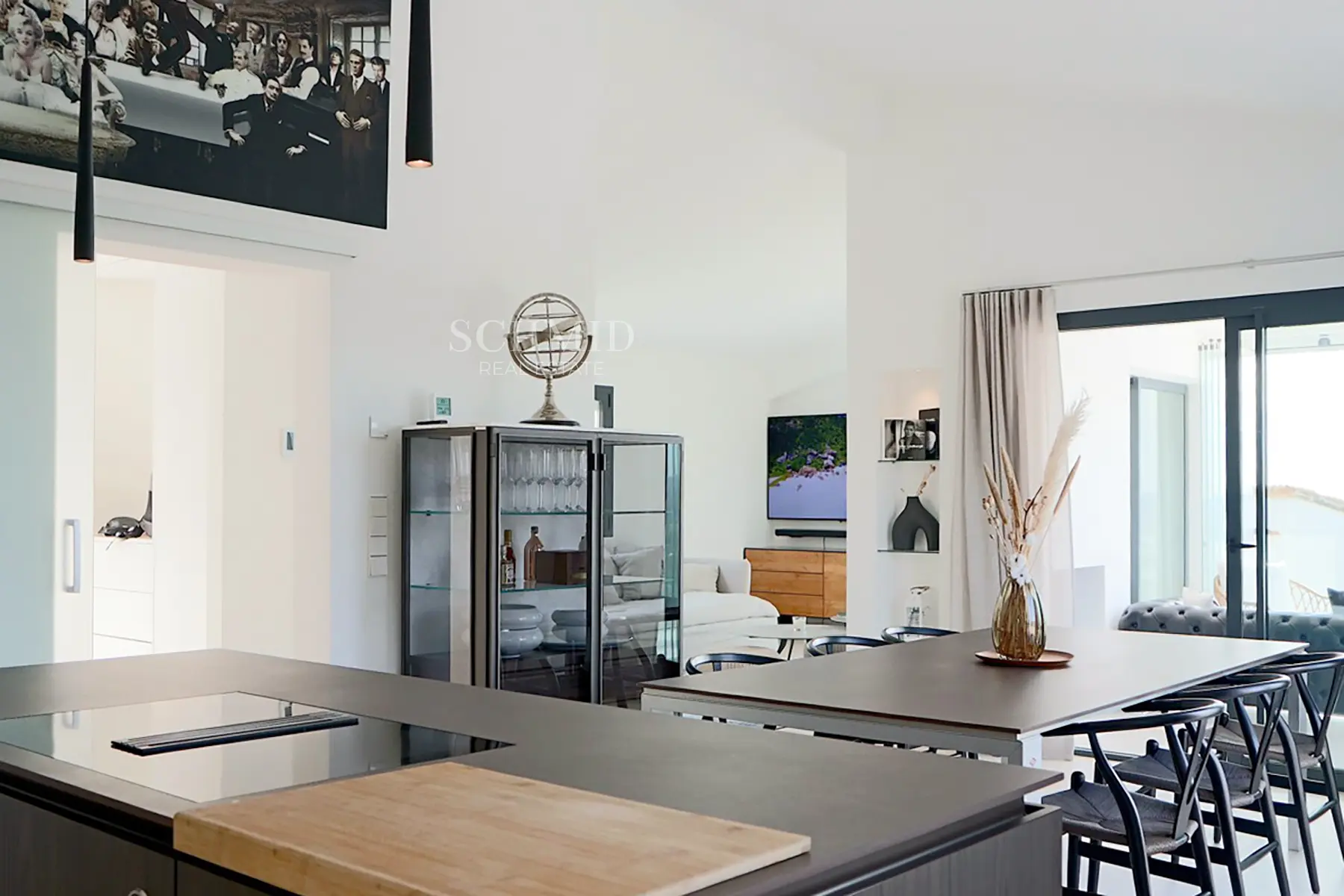Das Herzstück des erst kürzlich sanierten Hauses bildet der offen gestaltete Wohn- und Essbereich mit gemütlichem Kamin. Die hochwertige Designerküche mit Kochinsel ist mit erstklassigen Einbaugeräten von Miele ausgestattet und fügt sich harmonisch in das moderne Wohnkonzept ein.