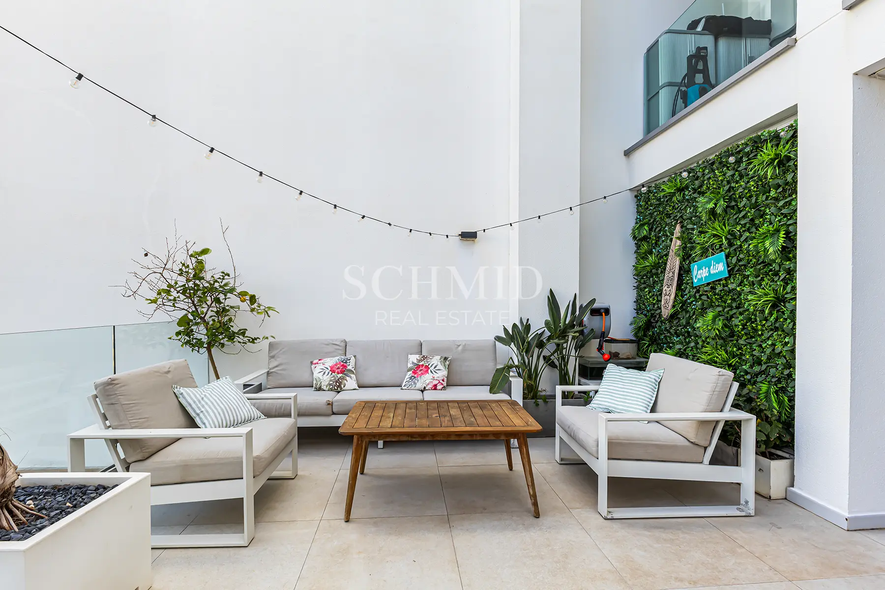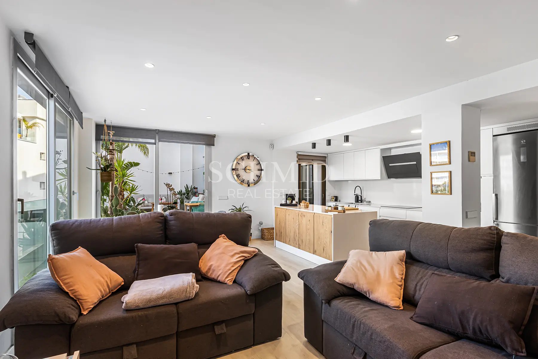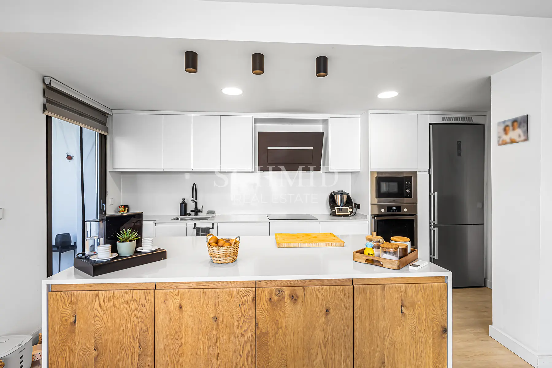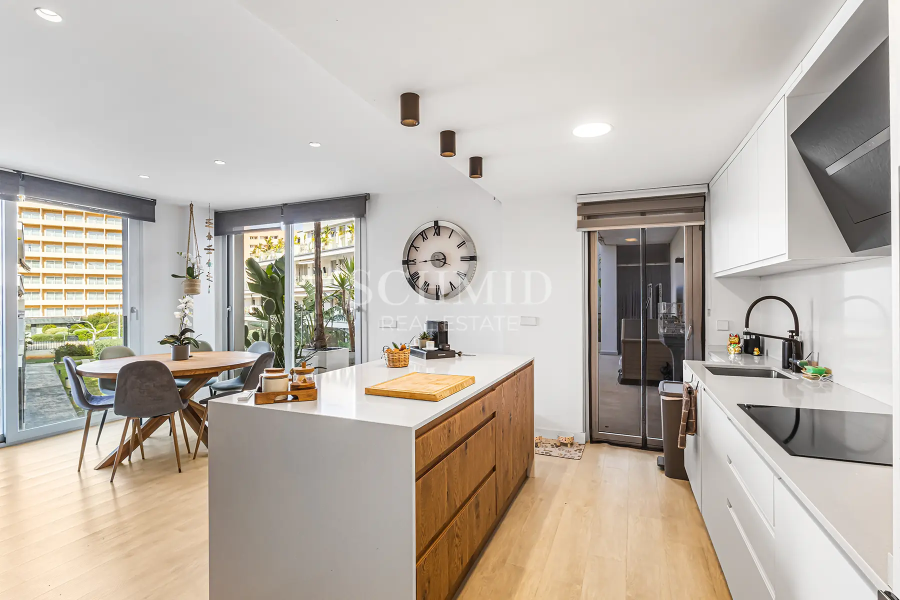 Diese moderne Wohnung in Palmanova überzeugt durch eine gelungene Raumaufteilung, hochwertige Ausstattung und ihre unmittelbare Nähe zum Strand. Der offen gestaltete Wohn- und Essbereich bildet das Herzstück der Immobilie und bietet direkten Zugang zur großzügigen Terrasse. Die hochwertige, offene Einbauküche mit zentraler Insel fügt sich harmonisch in den Wohnbereich ein und wird durch eine angrenzende Waschküche funktional ergänzt.