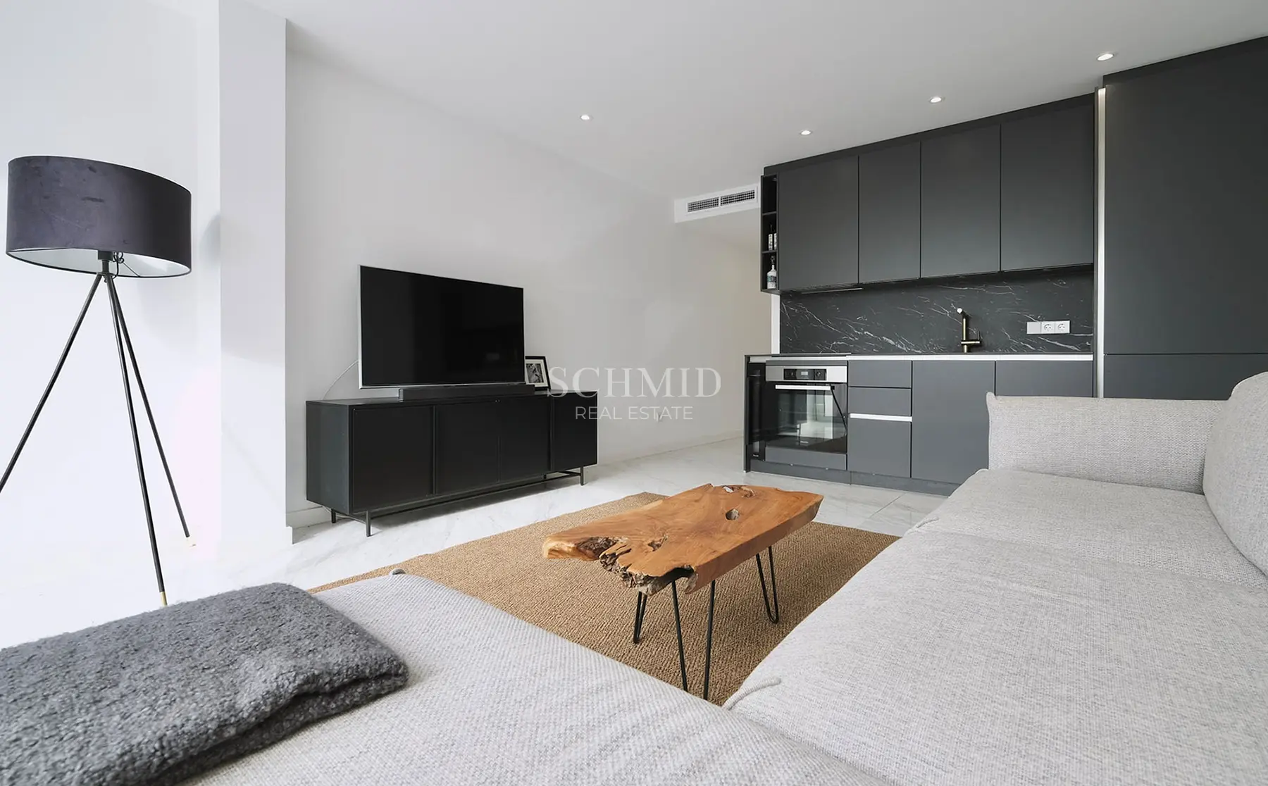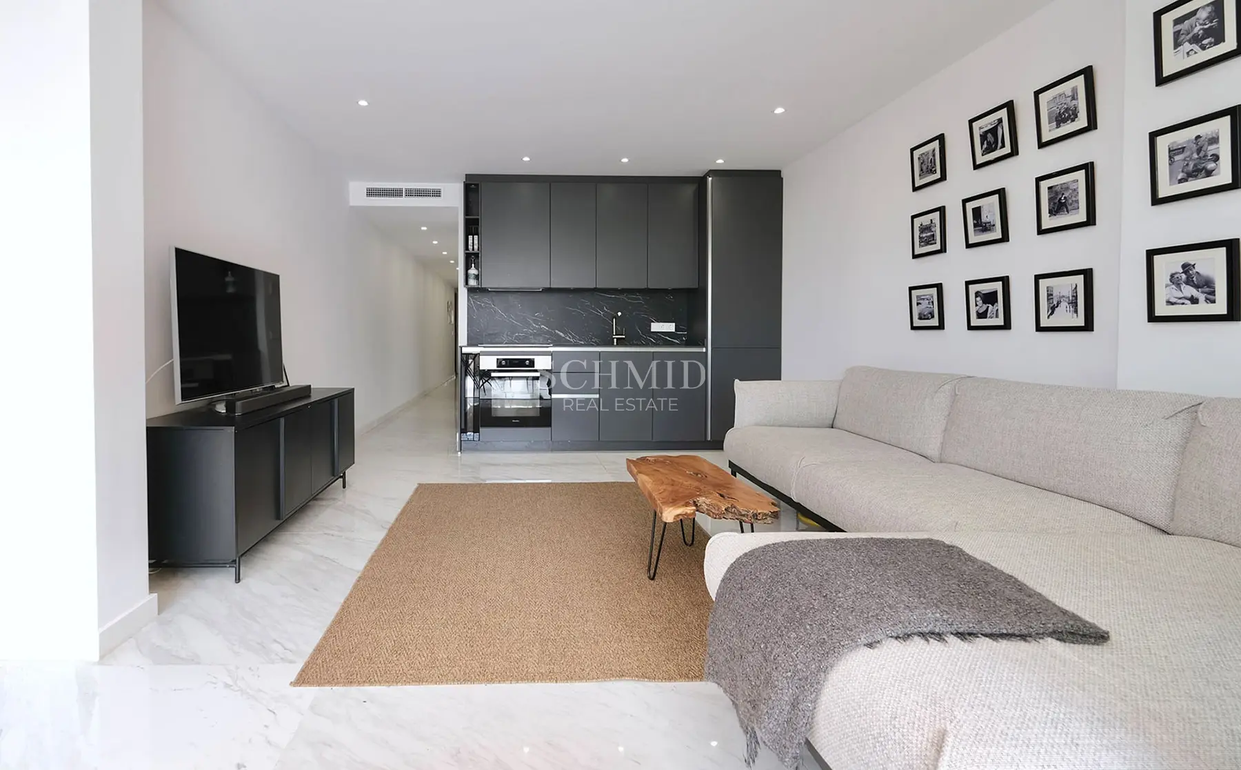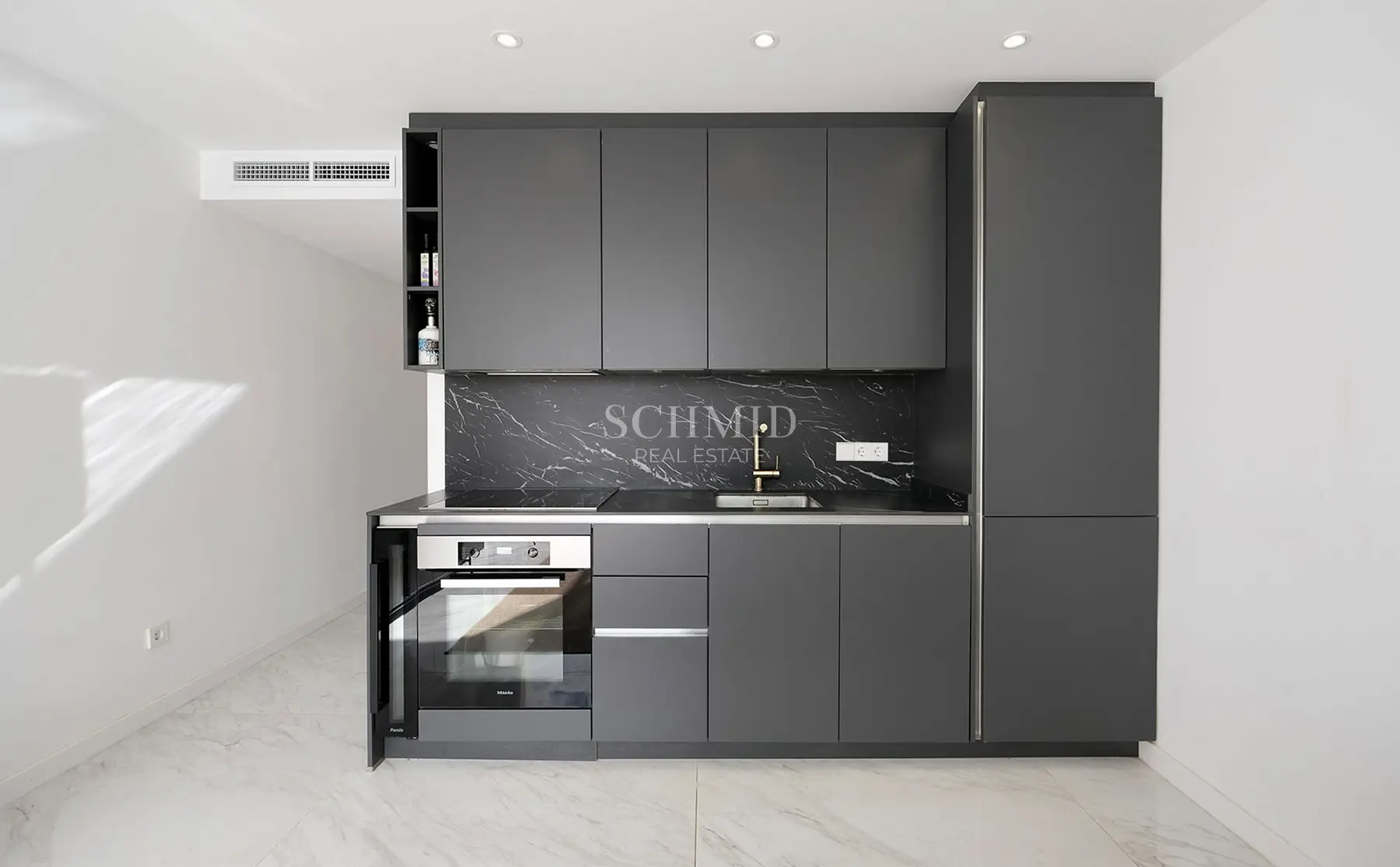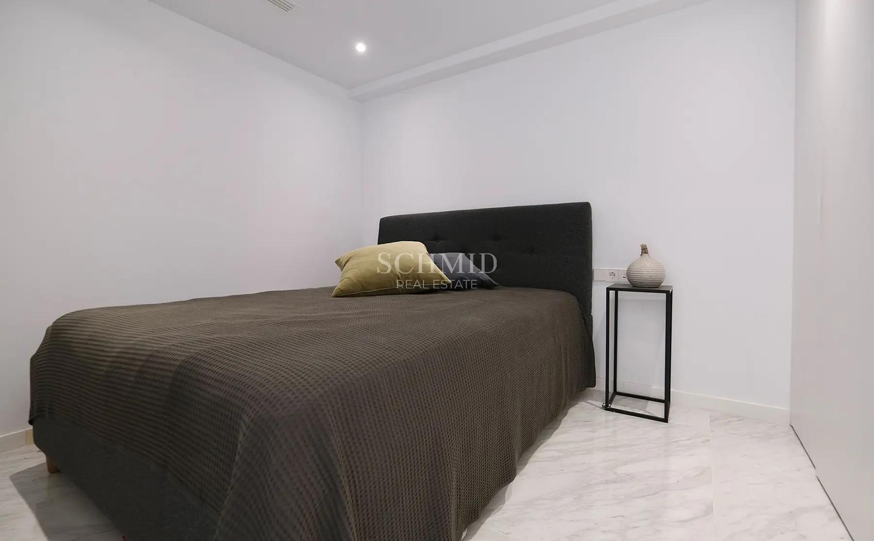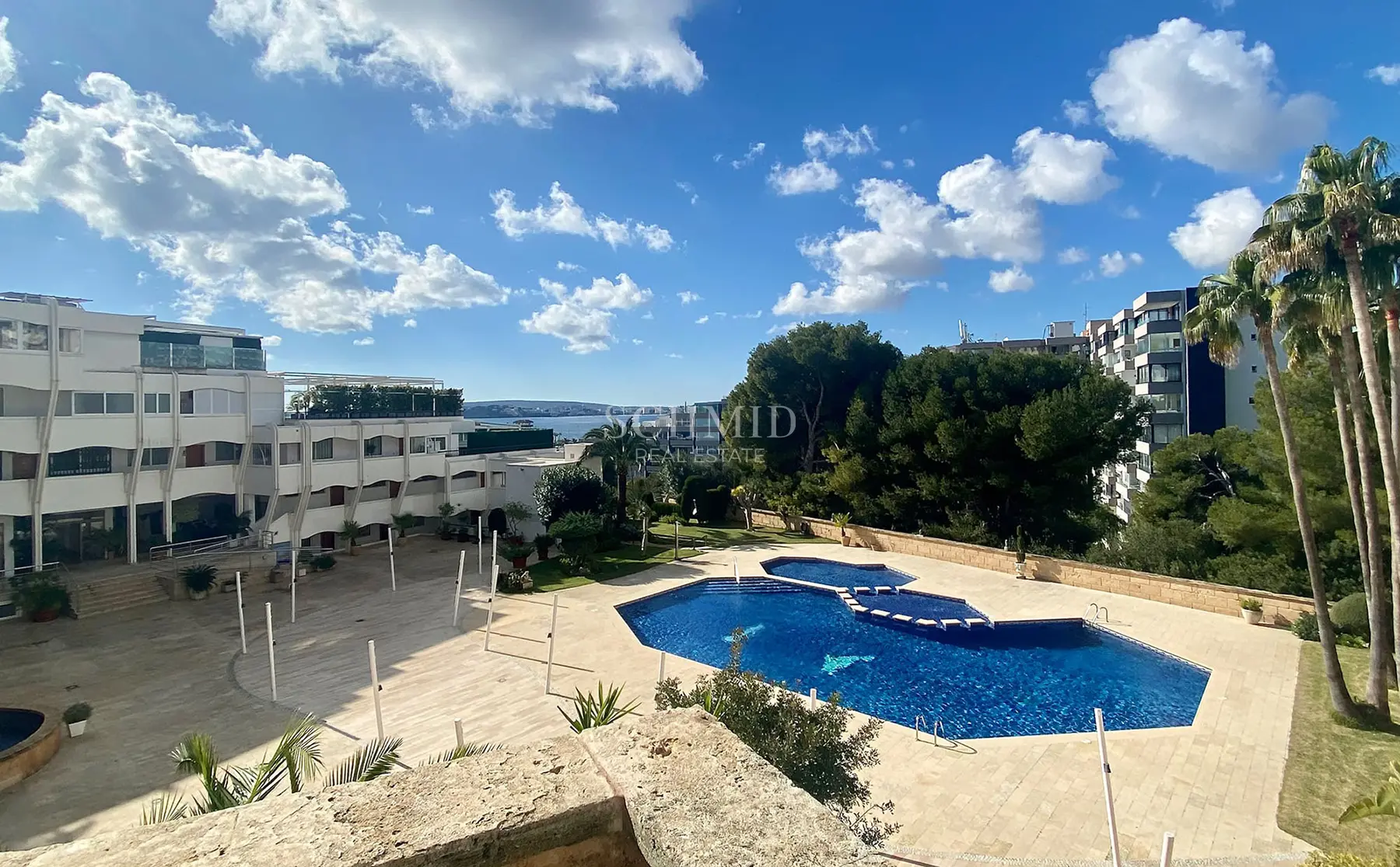 Im Inneren erwartet Sie ein heller, offen gestalteter Wohn- und Essbereich mit einer hochwertigen, modernen Einbauküche, die sich harmonisch in das Wohnkonzept einfügt. Große Fensterflächen sorgen für viel Tageslicht und schaffen eine angenehme Atmosphäre. Von hier aus gelangen Sie direkt auf die offene Terrasse, die einen schönen Blick auf die Poolanlage und das Meer eröffnet und dank ihrer Südwest-Ausrichtung zahlreiche Sonnenstunden garantiert.