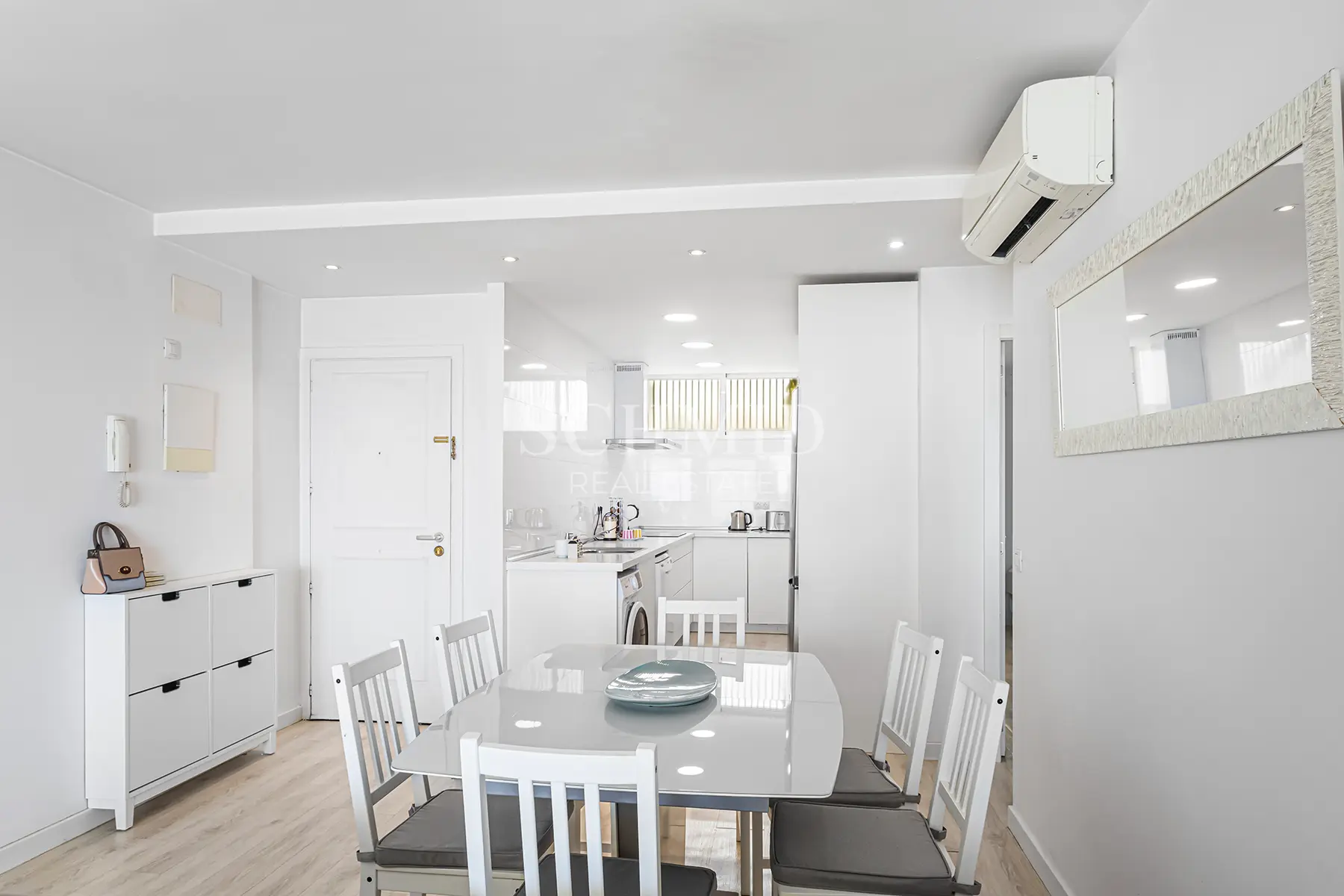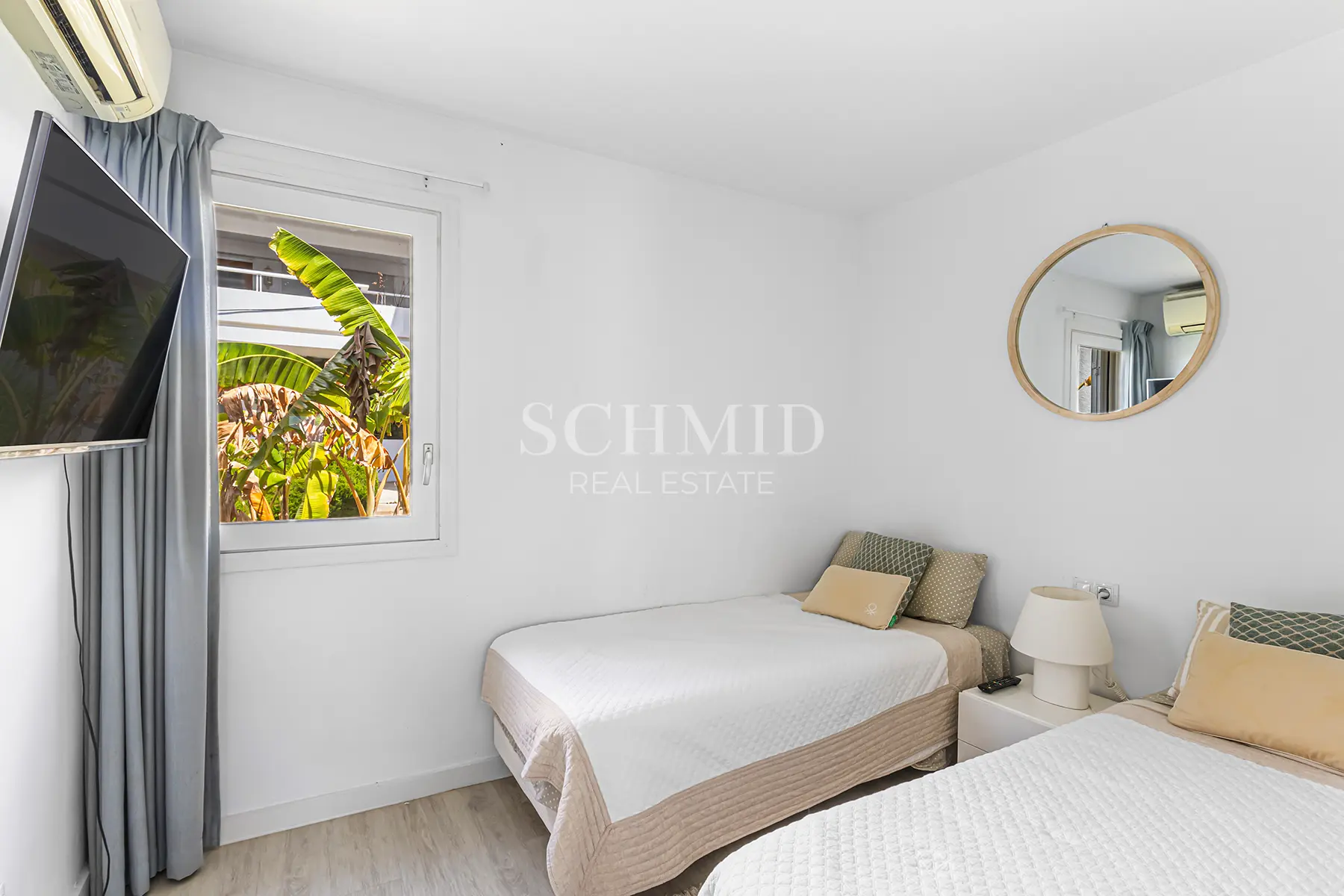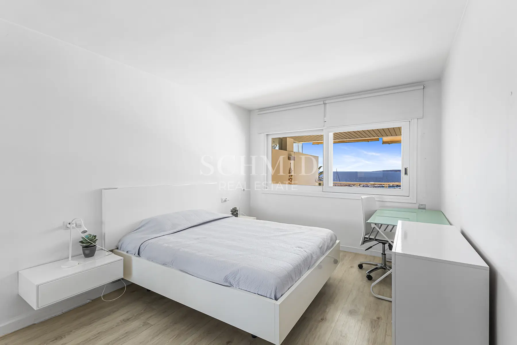 Die voll ausgestattete Einbauküche ist harmonisch in den Wohnbereich integriert. Das Hauptschlafzimmer besticht durch seinen herrlichen Meerblick sowie ein Bad en Suite. Ein weiteres Schlafzimmer, ebenfalls mit eigenem Bad en Suite, bietet zusätzlichen Raum für Gäste oder Familie.