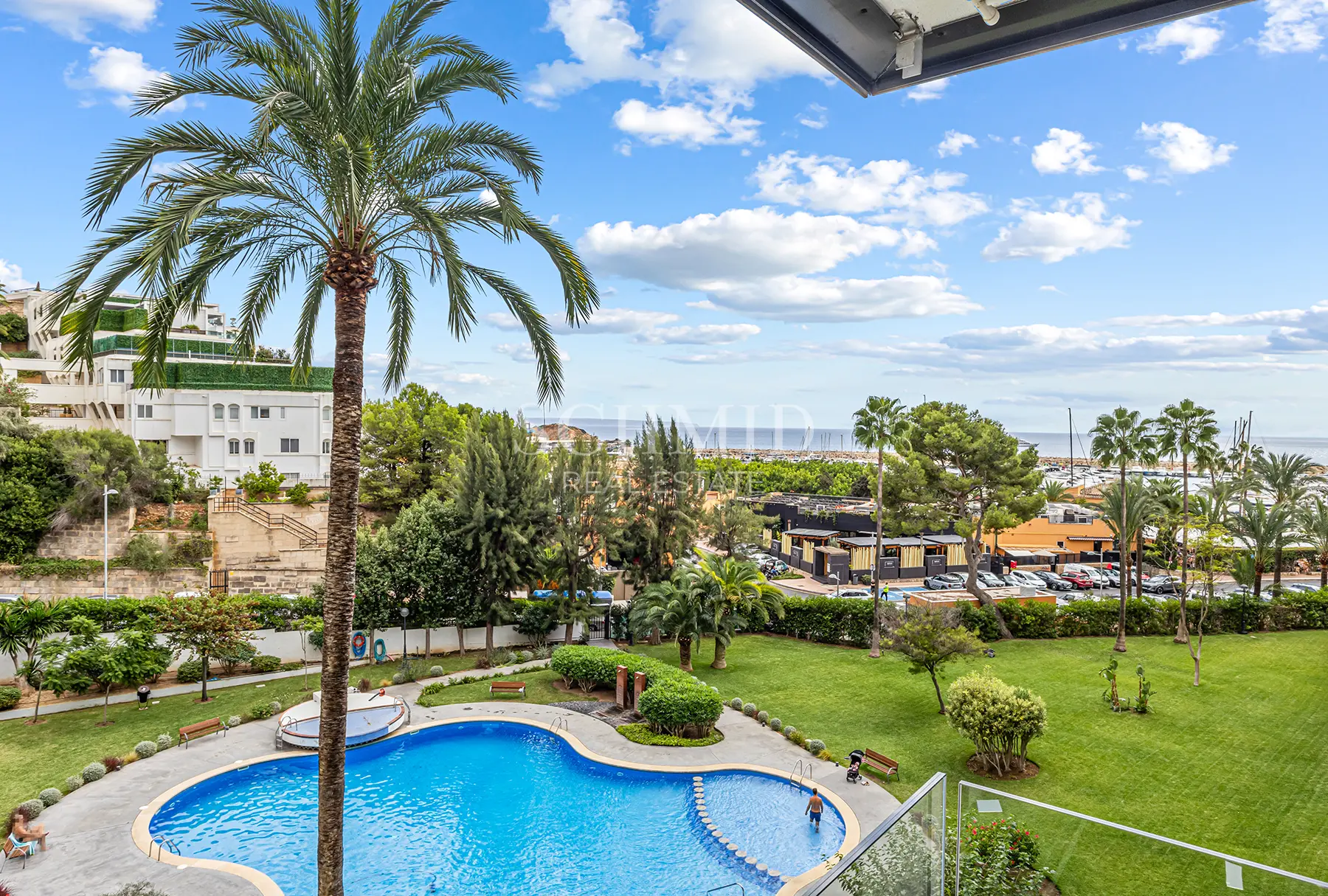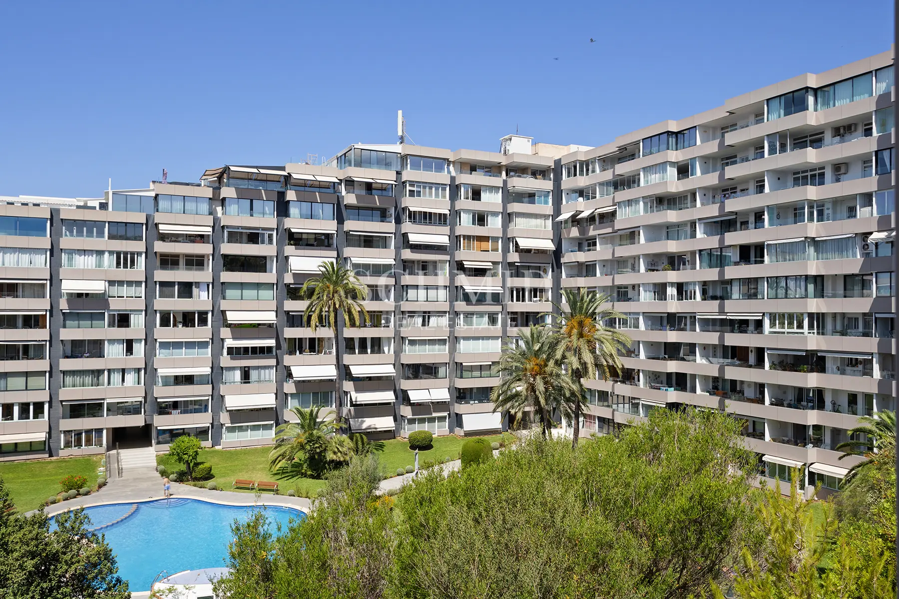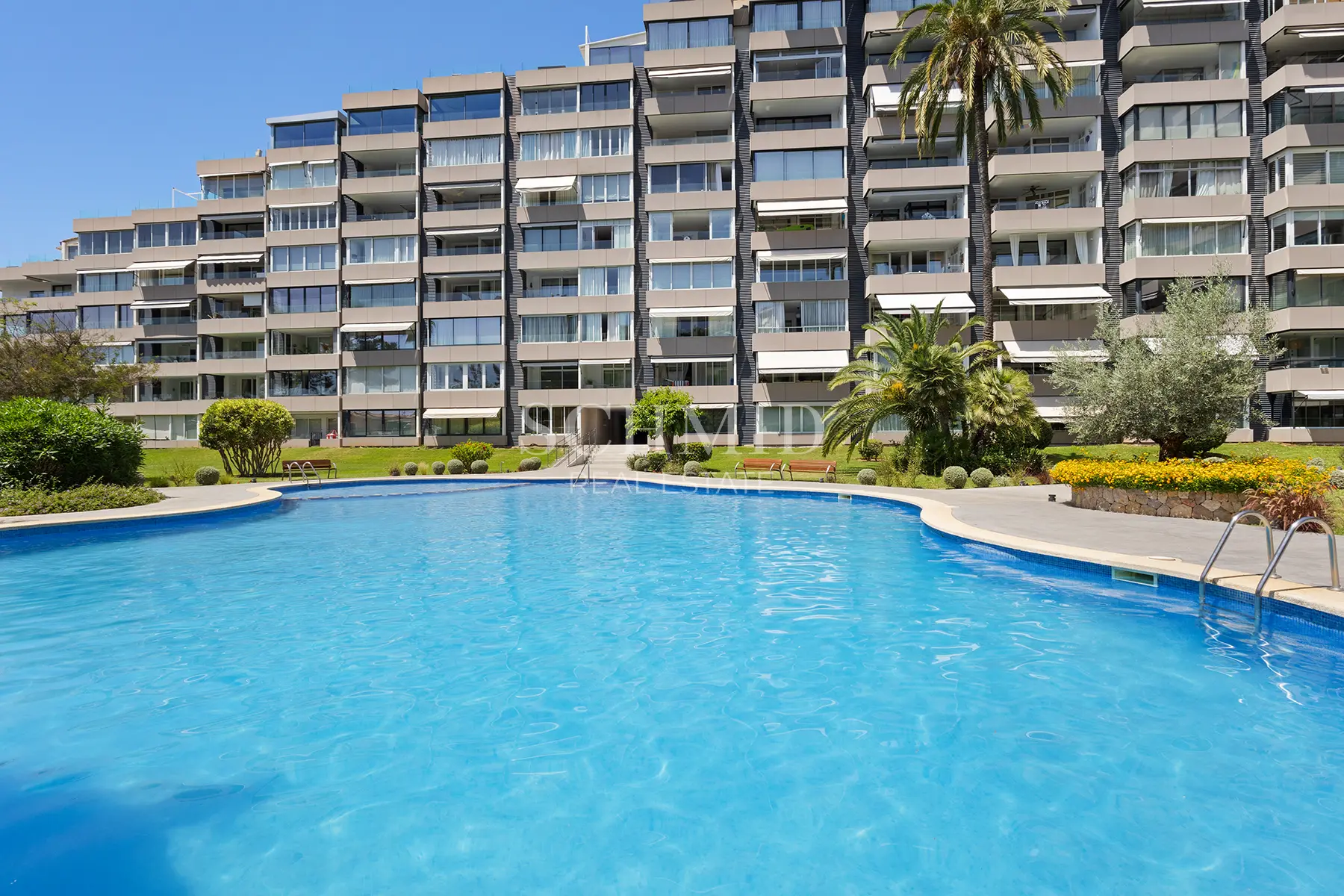 Die Wohnanlage Apartamentos de Mar ist sehr gepflegt und verfügt über einen schönen Gemeinschaftspool, gepflegte Gartenanlagen sowie einen direkten Zugang zum Hafen von Puerto Portals.