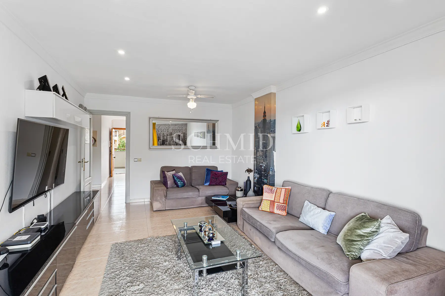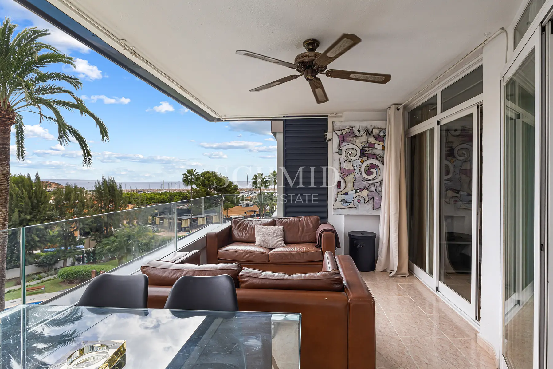 Der großzügige Wohn- und Essbereich öffnet sich zur überdachten Meerblick-Terrasse. Zwei Schlafzimmer – eines davon mit direktem Terrassenzugang – sowie zwei Badezimmer und eine separate Einbauküche bieten ein komfortables Raumkonzept.